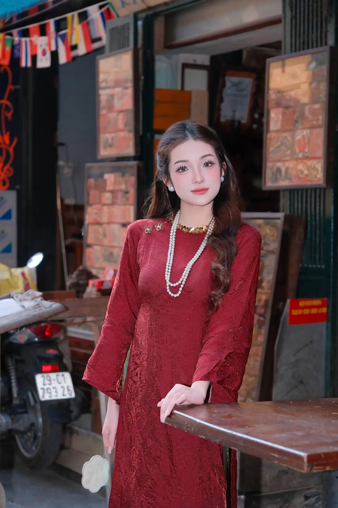This stunning photograph captures a young Vietnamese woman exuding grace and timeless elegance. She is adorned in a vibrant red traditional Ao Dai, symbolizing luck and passion, beautifully complemented by a delicate pearl necklace and matching earrings that enhance her regal charm. In her hands, she gently holds a bouquet of pristine white lilies, representing purity and innocence, creating a striking yet harmonious contrast with the rich red of her attire. Her gentle smile and captivating gaze tell a story of enduring Asian beauty. The subtly blurred urban background further accentuates her serene presence, making her the focal point of a scene that blends traditional aesthetics with modern street allure. This image beautifully portrays the rich cultural heritage and captivating charm of Vietnamese women.