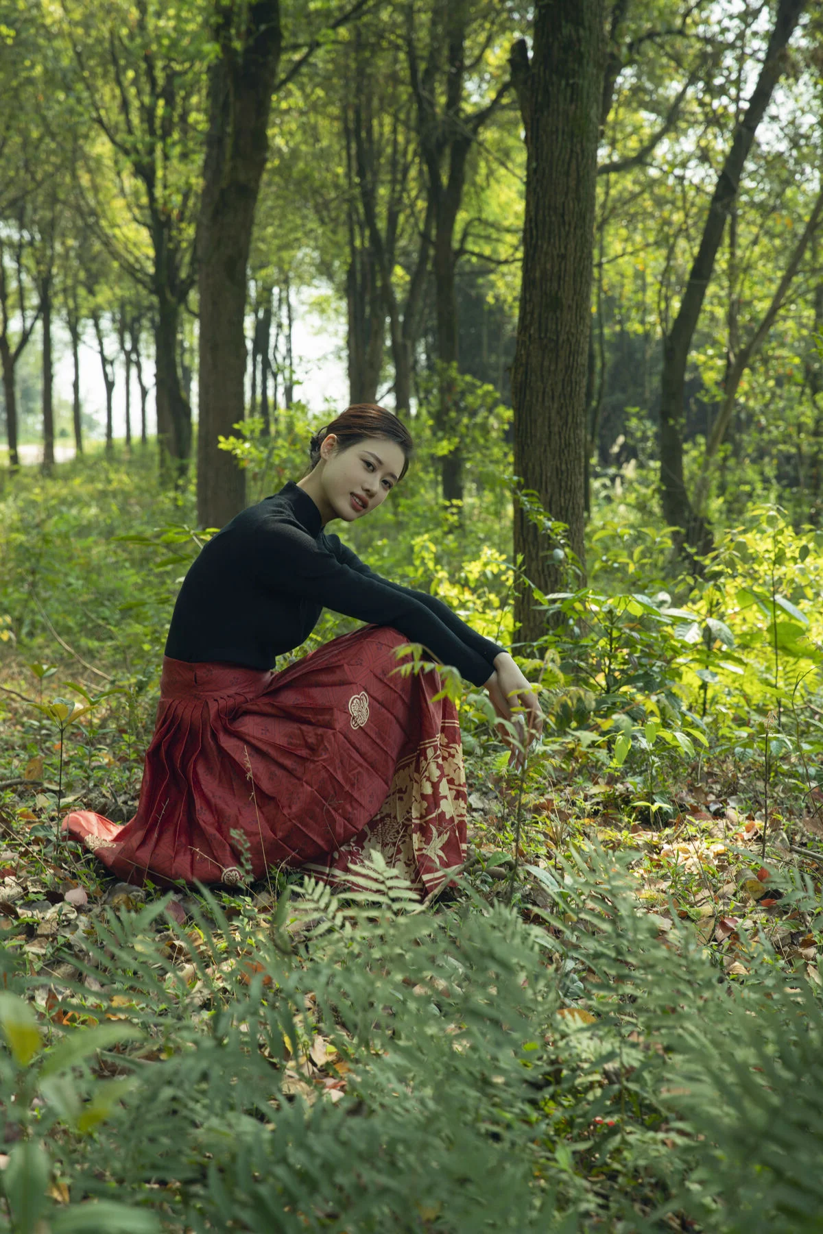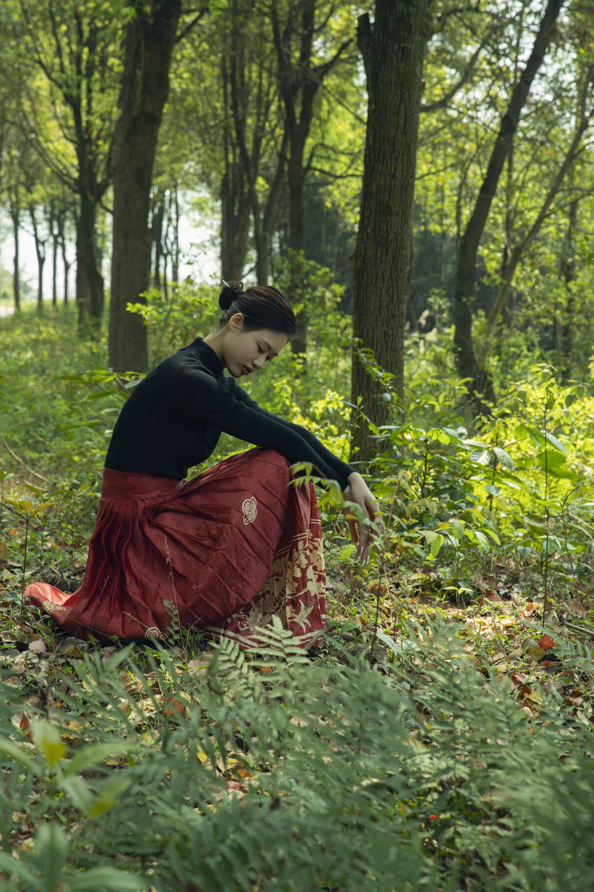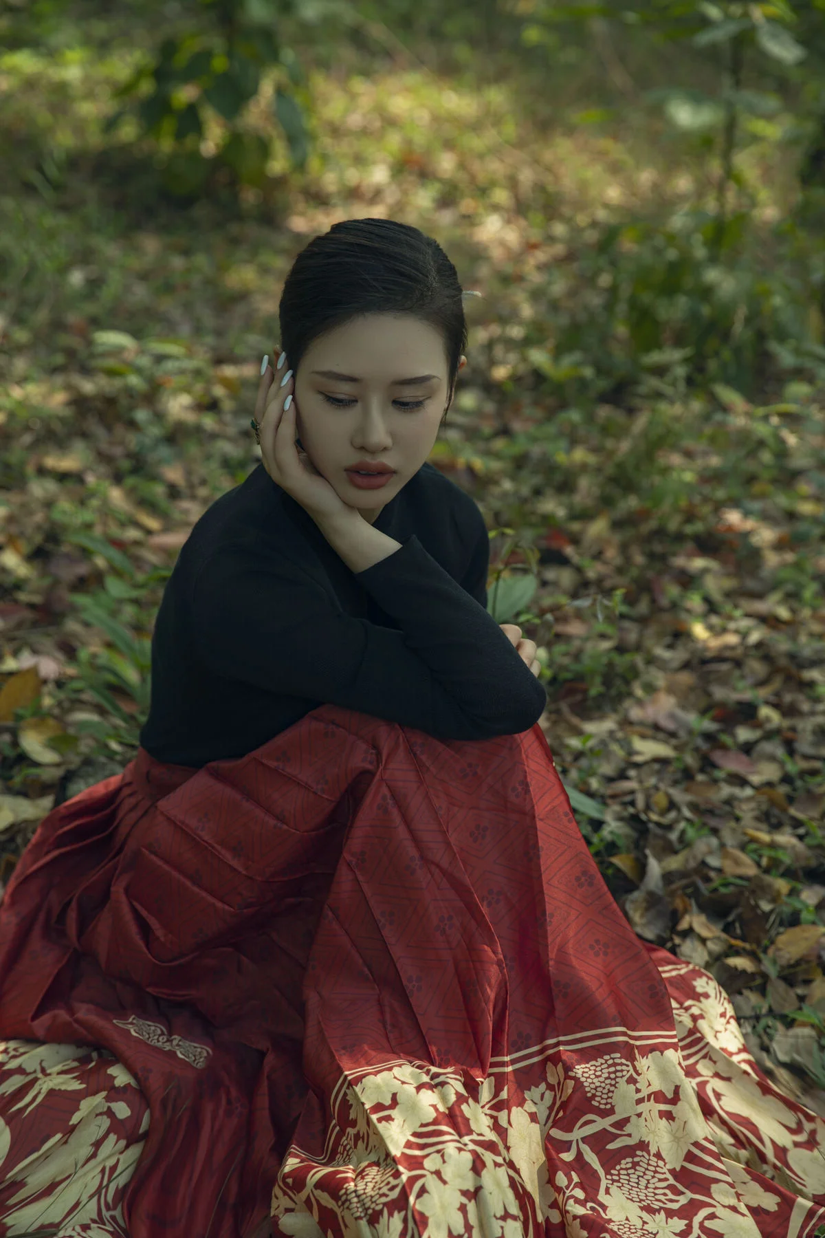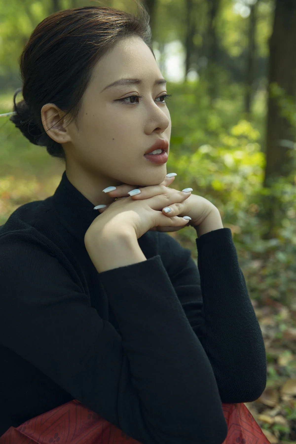 The YiTuYu Vol8784 photo collection features ChenalingCL amidst a poetic natural landscape She wears a classic deep red horse skirt adorned with intricate patterns exuding an elegant and traditional beauty Paired with a simple black long-sleeved top ChenalingCLs attire creates a harmonious contrast highlighting her grace and gentle demeanor Every step she takes on the tree-lined path seems to tell a story of the interplay between cultural beauty and the tranquility of nature This image is not just a fashion photograph but also a work of art inviting viewers to admire the ethereal and captivating charm of the East Asian woman
