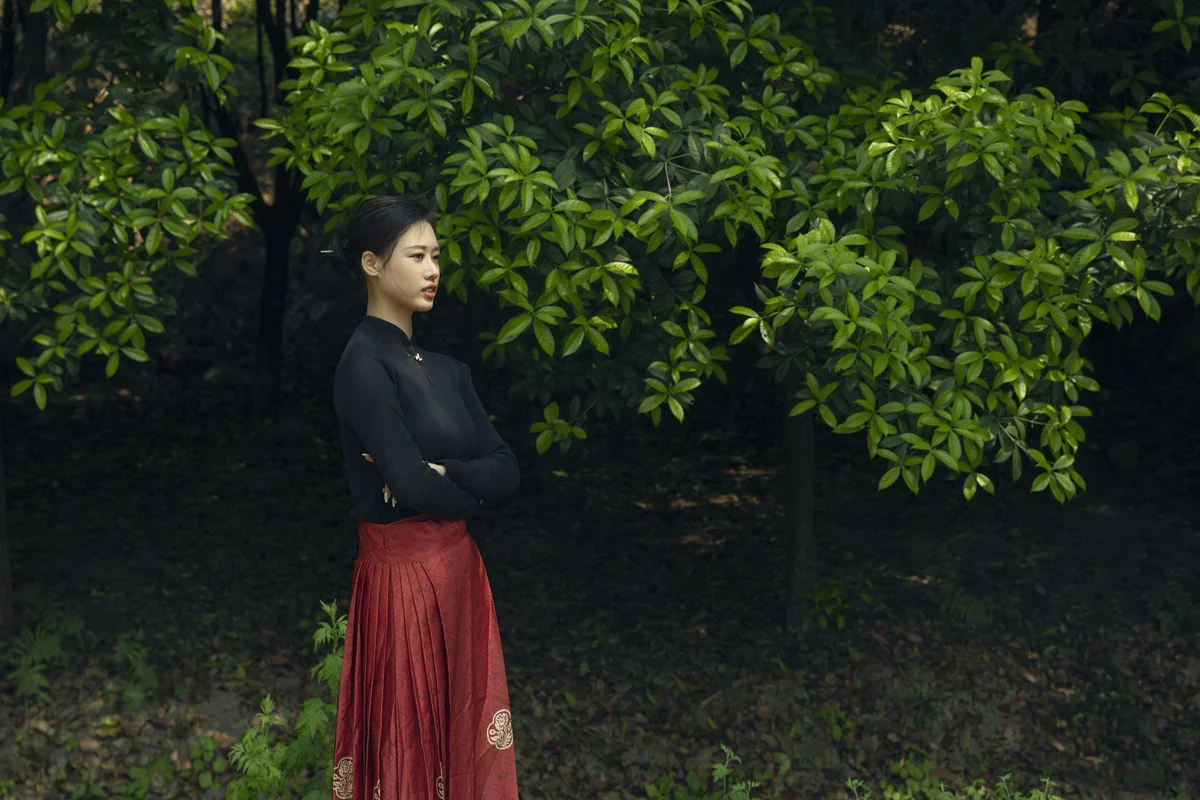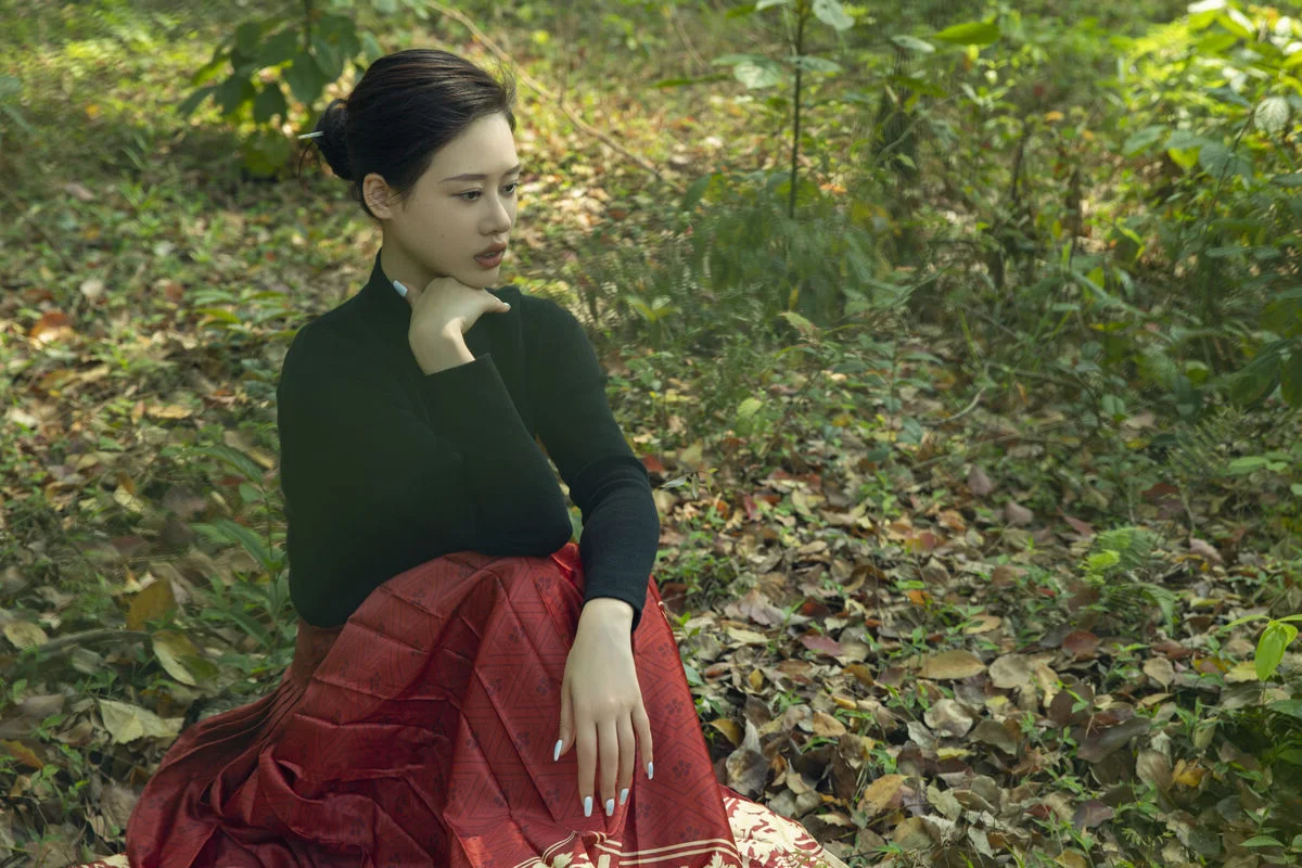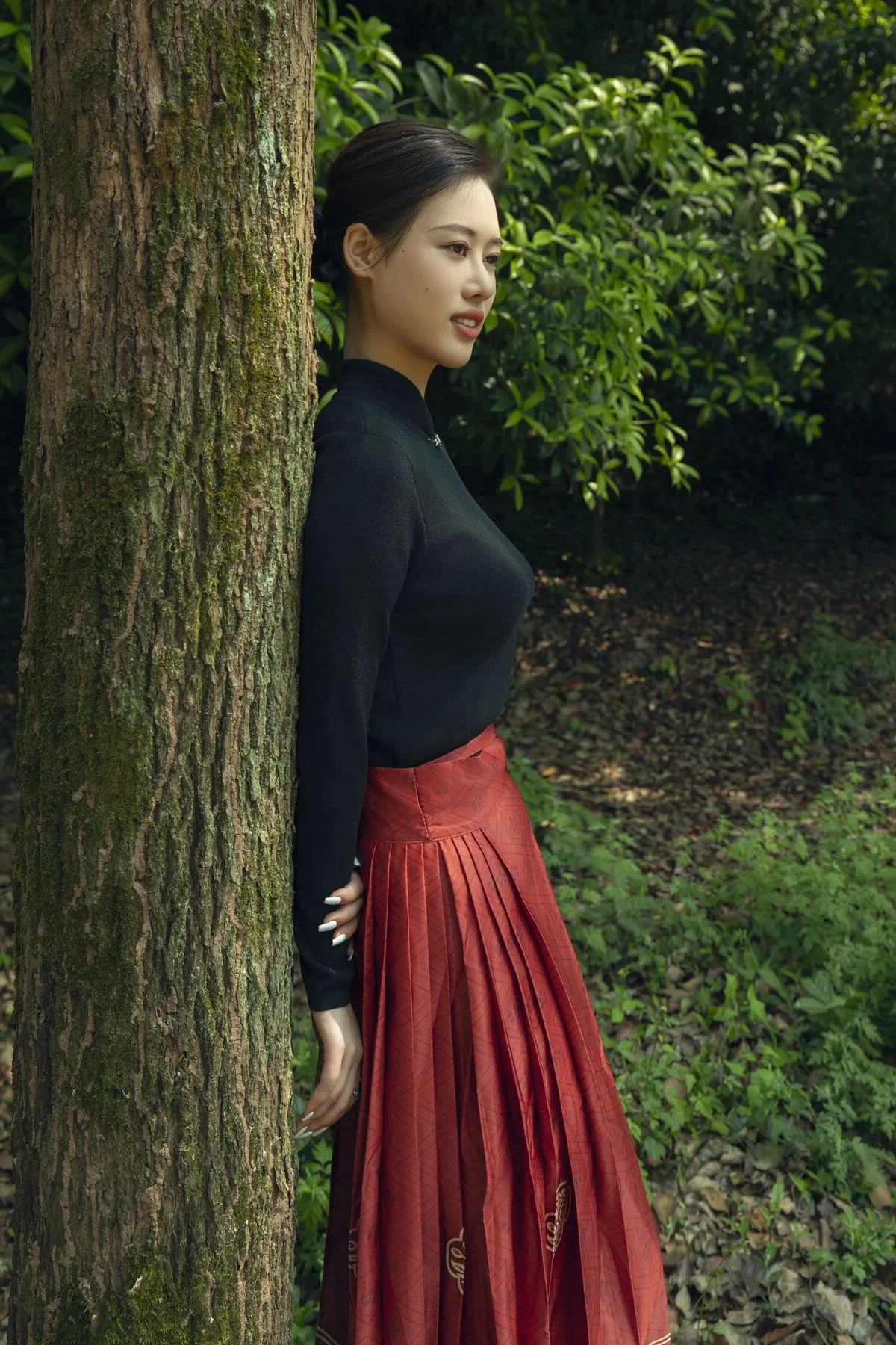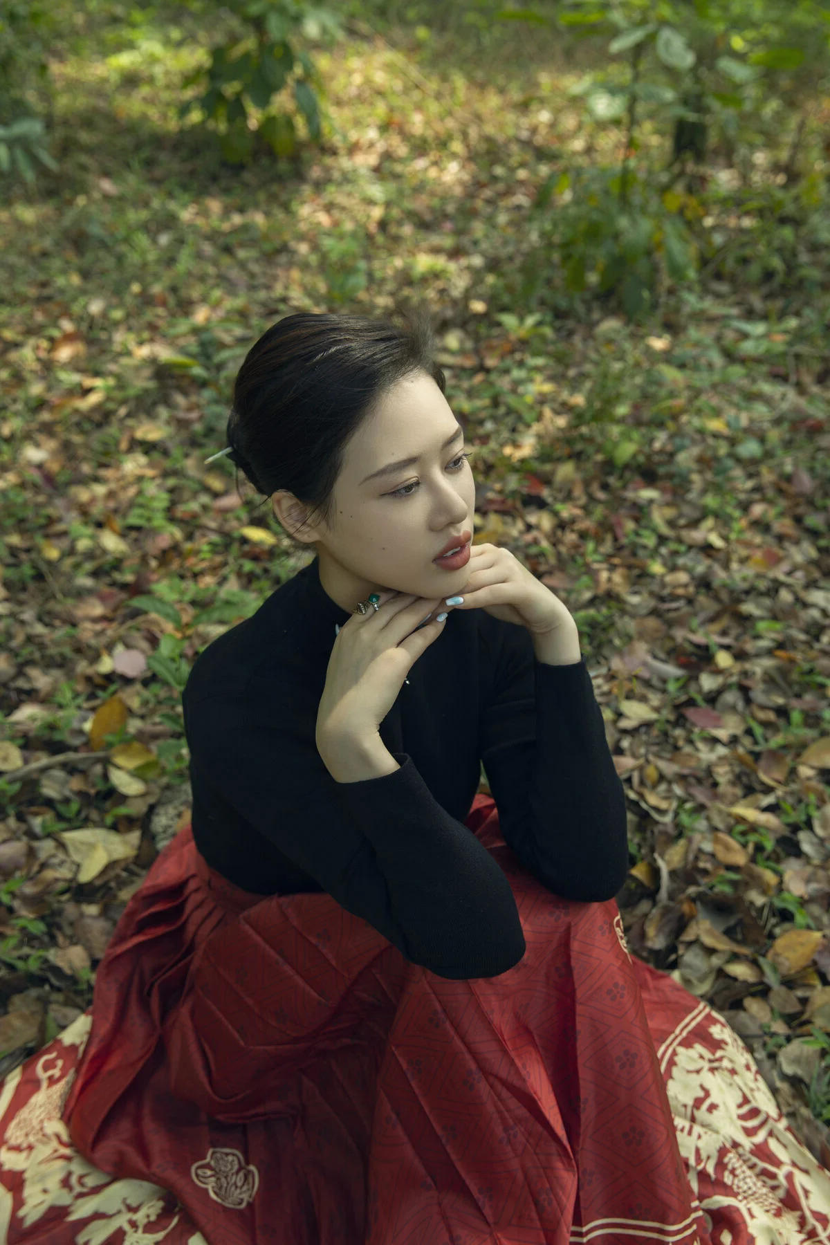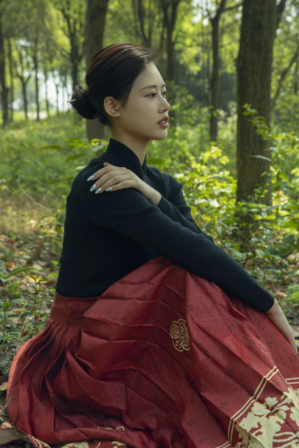 The YiTuYu Vol8784 photo collection features ChenalingCL amidst a poetic natural landscape She wears a classic deep red horse skirt adorned with intricate patterns exuding an elegant and traditional beauty Paired with a simple black long-sleeved top ChenalingCLs attire creates a harmonious contrast highlighting her grace and gentle demeanor Every step she takes on the tree-lined path seems to tell a story of the interplay between cultural beauty and the tranquility of nature This image is not just a fashion photograph but also a work of art inviting viewers to admire the ethereal and captivating charm of the East Asian woman