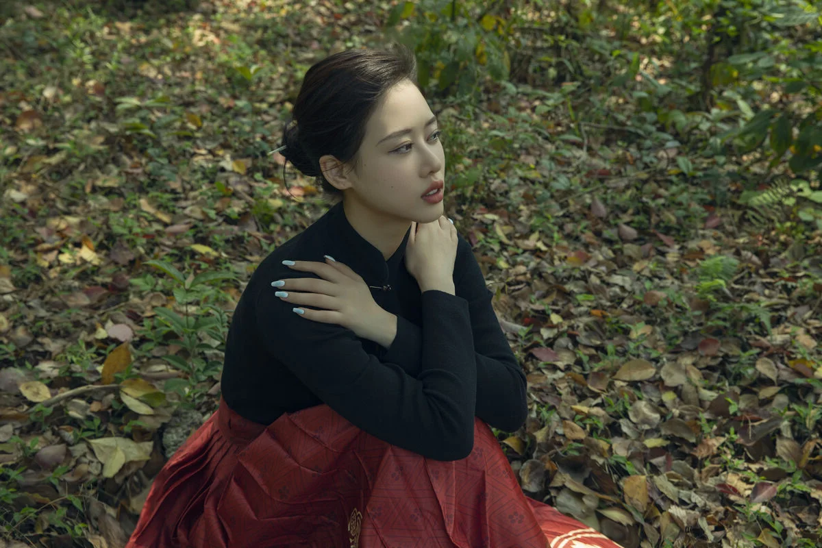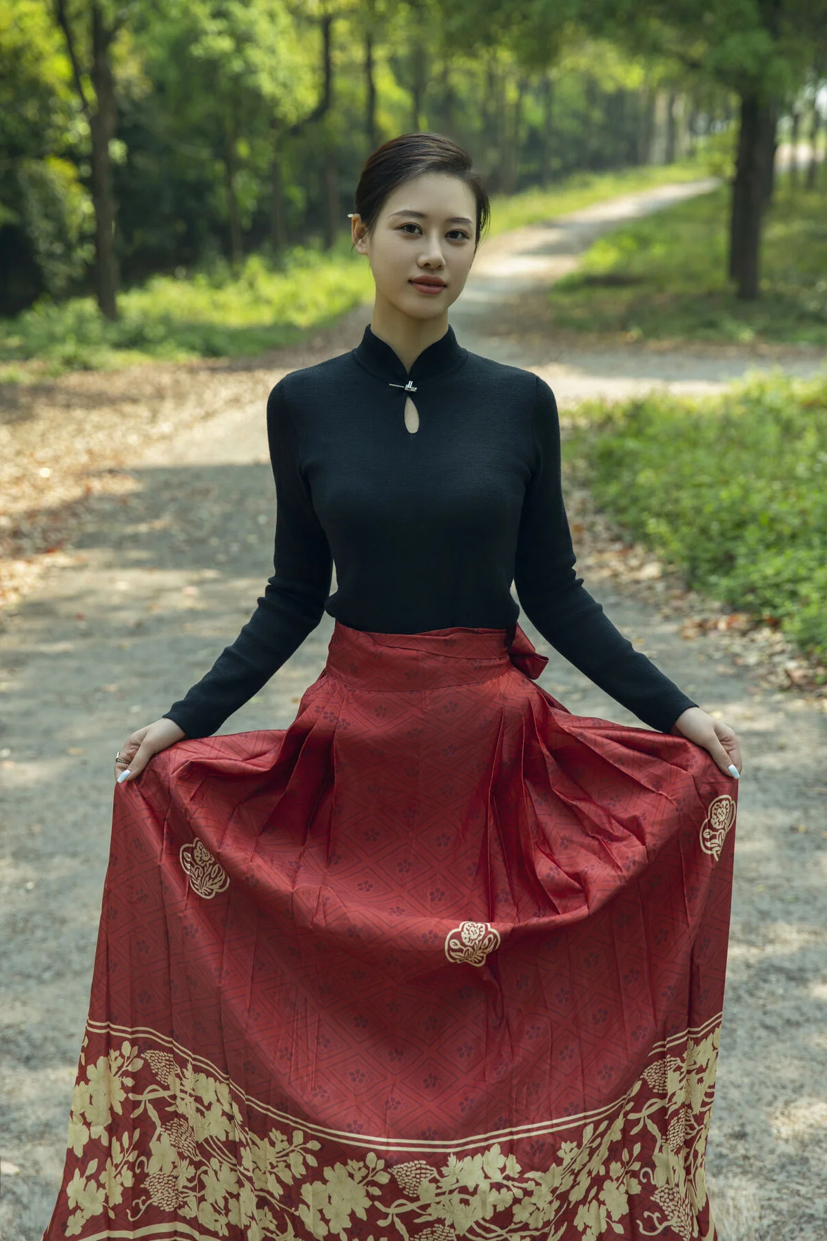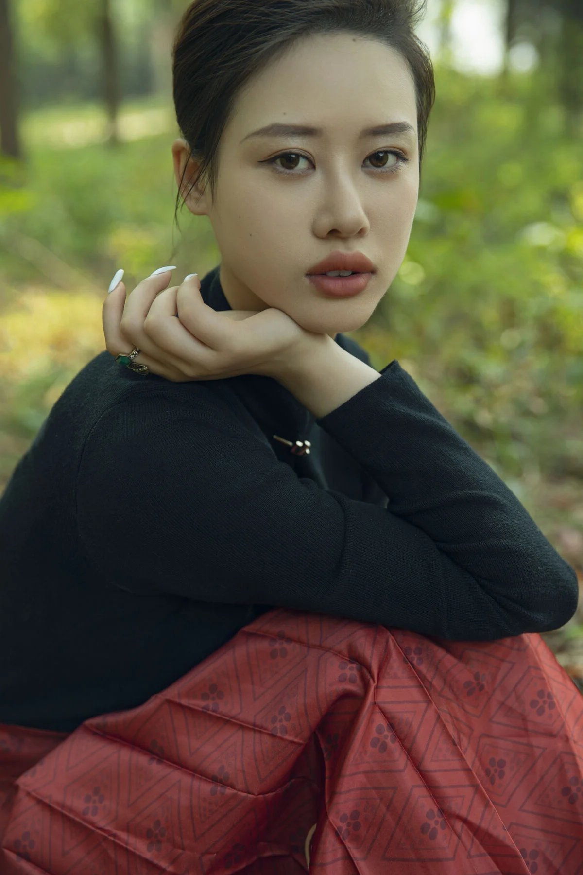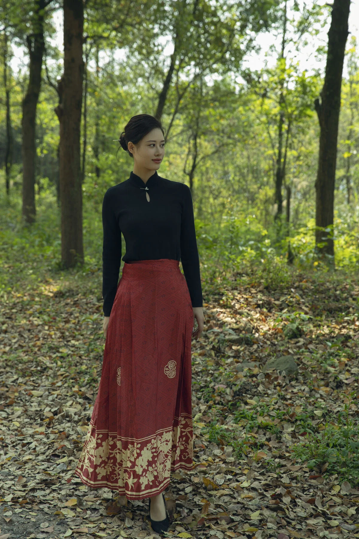 The YiTuYu Vol8784 photo collection features ChenalingCL amidst a poetic natural landscape She wears a classic deep red horse skirt adorned with intricate patterns exuding an elegant and traditional beauty Paired with a simple black long-sleeved top ChenalingCLs attire creates a harmonious contrast highlighting her grace and gentle demeanor Every step she takes on the tree-lined path seems to tell a story of the interplay between cultural beauty and the tranquility of nature This image is not just a fashion photograph but also a work of art inviting viewers to admire the ethereal and captivating charm of the East Asian woman