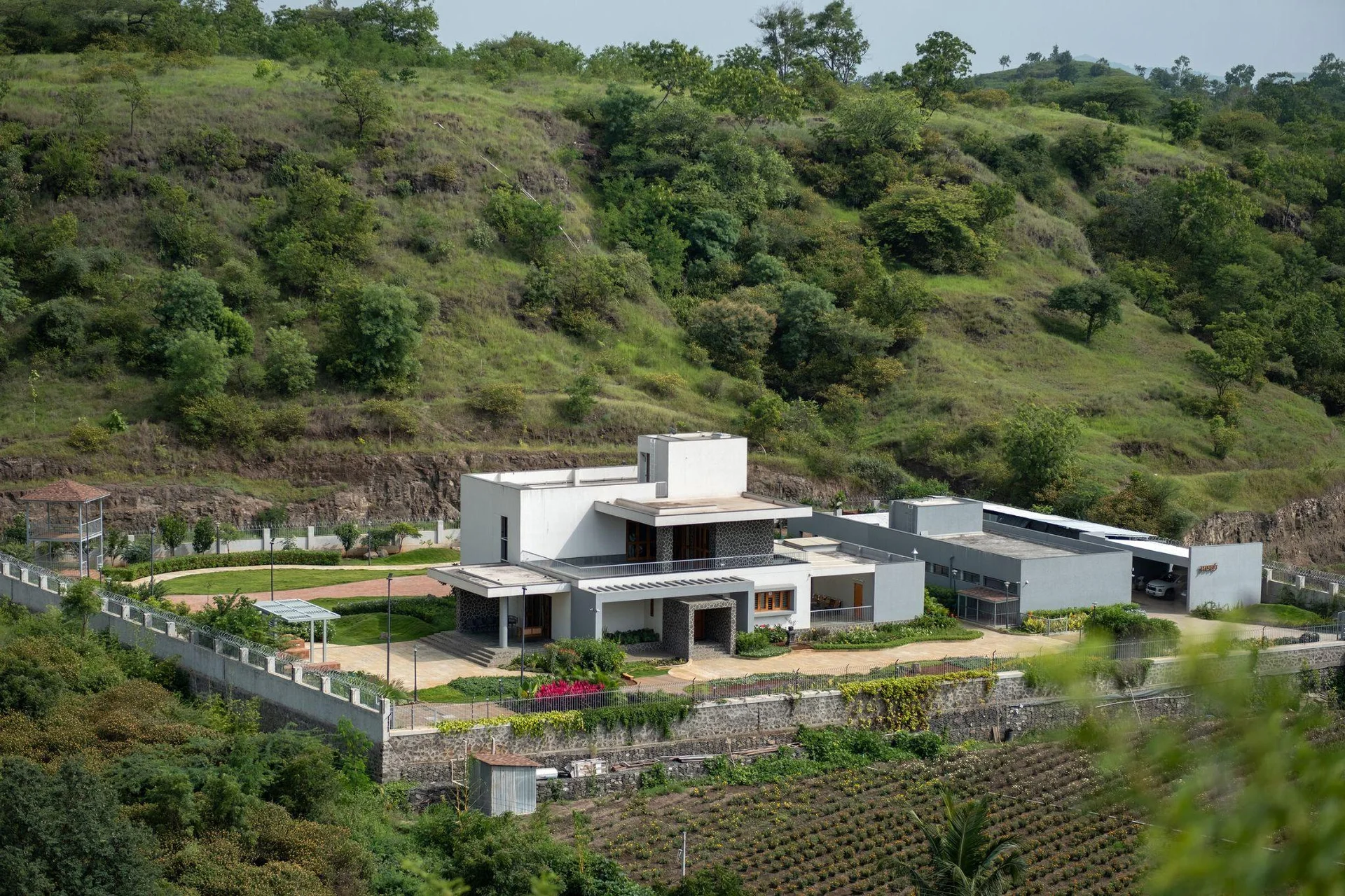Discover the epitome of sustainable luxury with this contemporary vacation villa located in the scenic sloping terrains of Ahilyanagar, India. This architectural masterpiece is thoughtfully designed for multi-generational living, ensuring that every family member finds tranquility and connection within its walls. Built with a focus on passive design principles, the villa utilizes its unique hillside topography to optimize natural ventilation and light, creating a living environment that breathes with the landscape.The design philosophy centers on 'slow living,' encouraging a lifestyle that prioritizes wellness and a deep connection to nature. Large glass facades and open-plan layouts blur the lines between the interior and the lush outdoor surroundings, making the home feel like an extension of the earth itself. As a modern farmhouse, it combines rustic charm with sleek, minimalist aesthetics, utilizing sustainable materials that respect the local ecosystem.