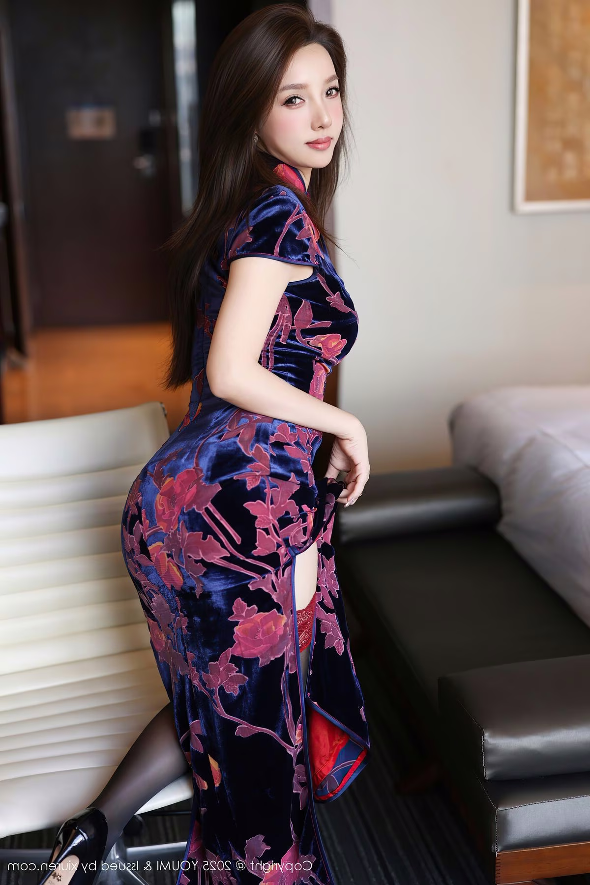 Discover captivating beauty in the YouMi Vol.1158 collection, where Tao Tao Yao Yao Twins shine with elegant and alluring charisma. The main subject is featured in a luxurious velvet Qipao, its mysterious navy blue hue adorned with prominent floral patterns, skillfully accentuating her figure. Delicate black stockings paired with a graceful pose on a modern office chair create an intriguing contrast, subtly enhancing her allure. Her confident gaze and captivating demeanor embody timeless Asian beauty. This harmonious blend of traditional charm and contemporary style presents an unforgettable and deeply impressive image.