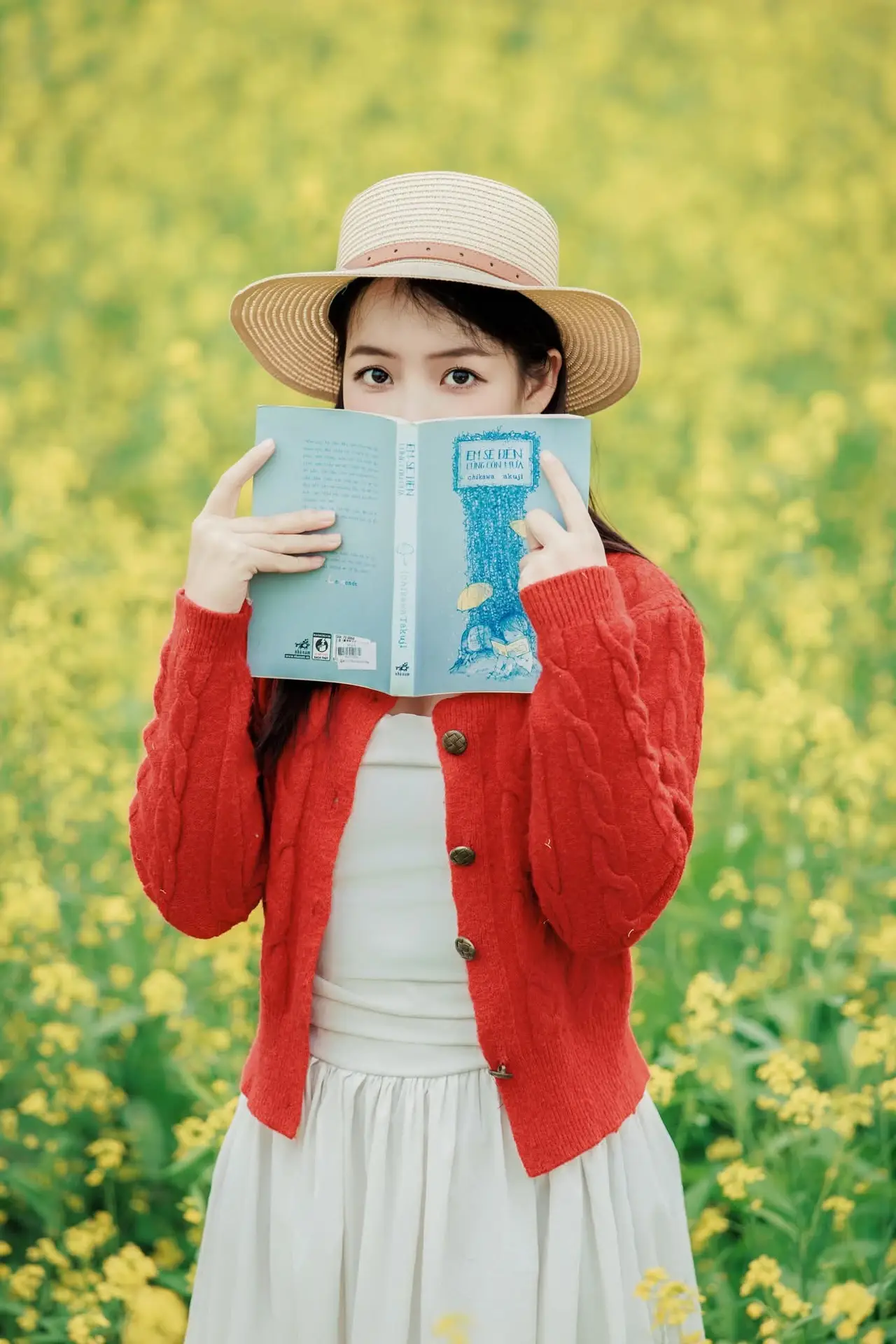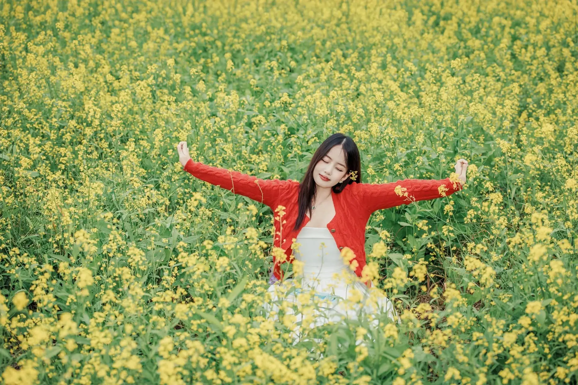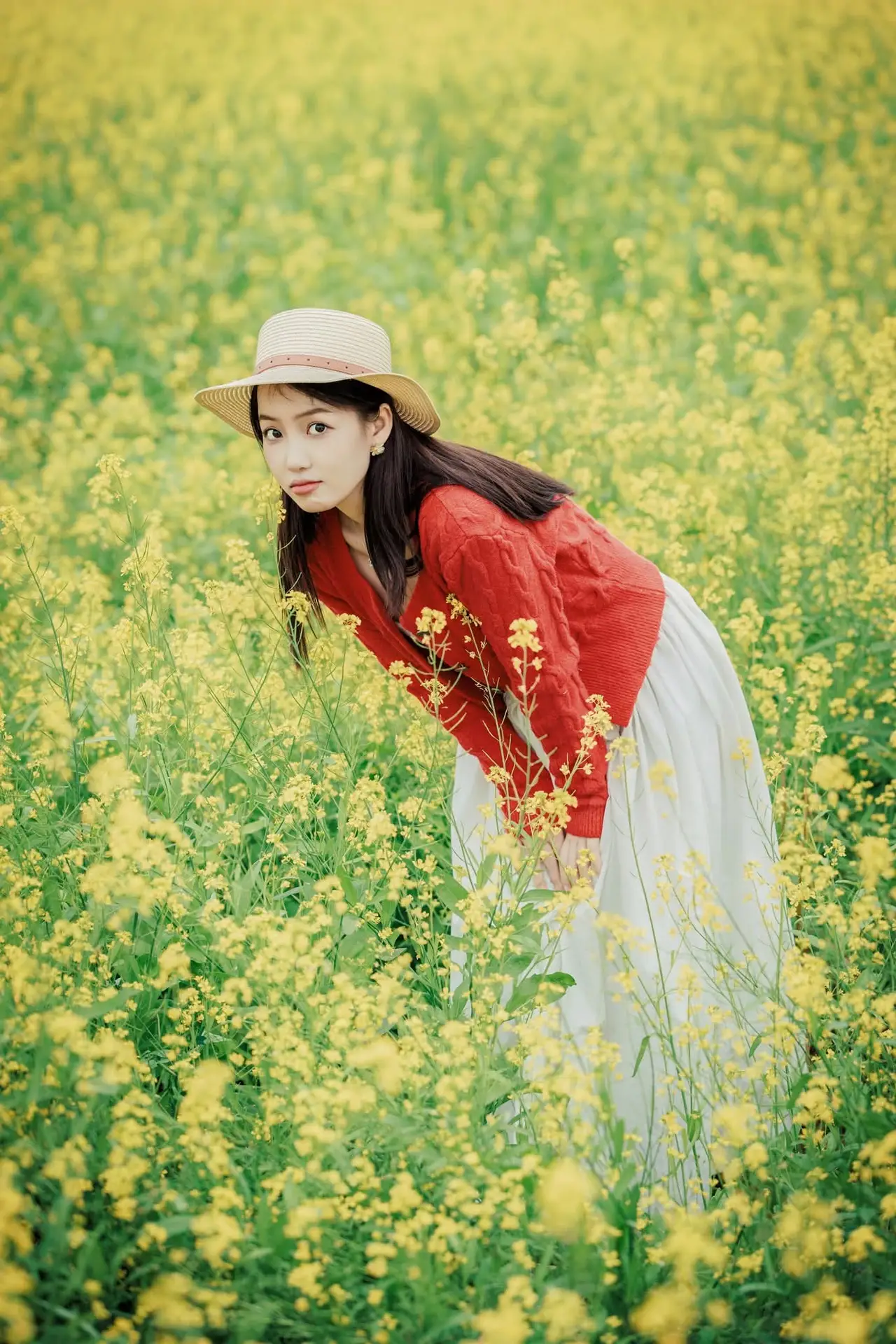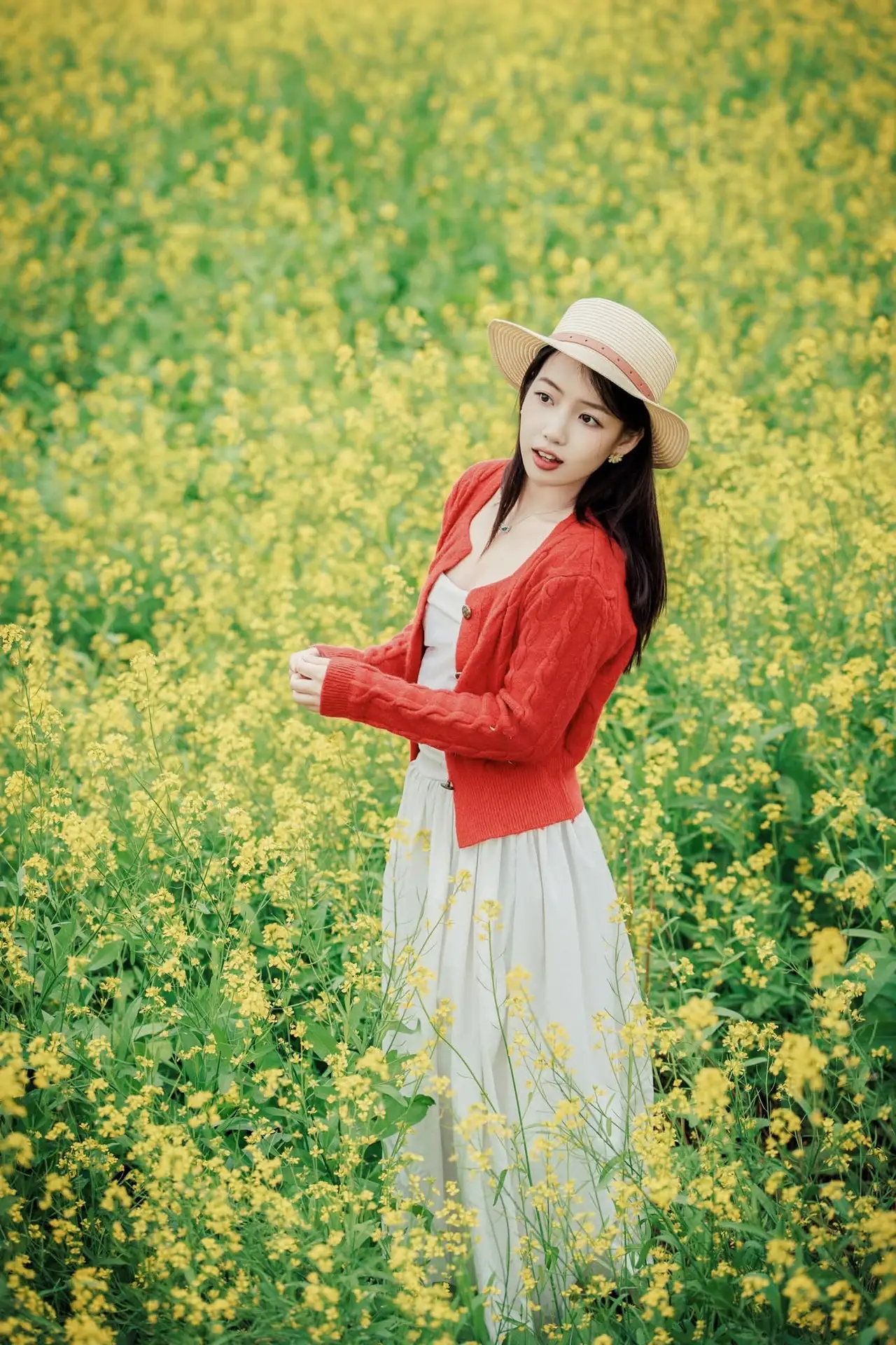 This captivating image portrays a beautiful young woman immersed in a vast, vibrant field of yellow rapeseed flowers bathed in the spring sunshine. Dressed in a cozy red knitted cardigan and a chic straw hat, she radiates a gentle, pure, and poetic beauty. Her thoughtful gaze, coupled with her holding a small book and a delicate yellow flower, adds a layer of romance and depth to the entire scene. This picture symbolizes youthful charm, new vitality, and a complete immersion into the fresh nature of springtime. The harmonious blend of the girl's attire and the radiant golden hues of the rapeseed blossoms creates a peaceful, emotional, and thought-provoking moment.#GirlInFlowers #RapeseedField #SpringBeauty #GentleCharm #YouthfulVibes