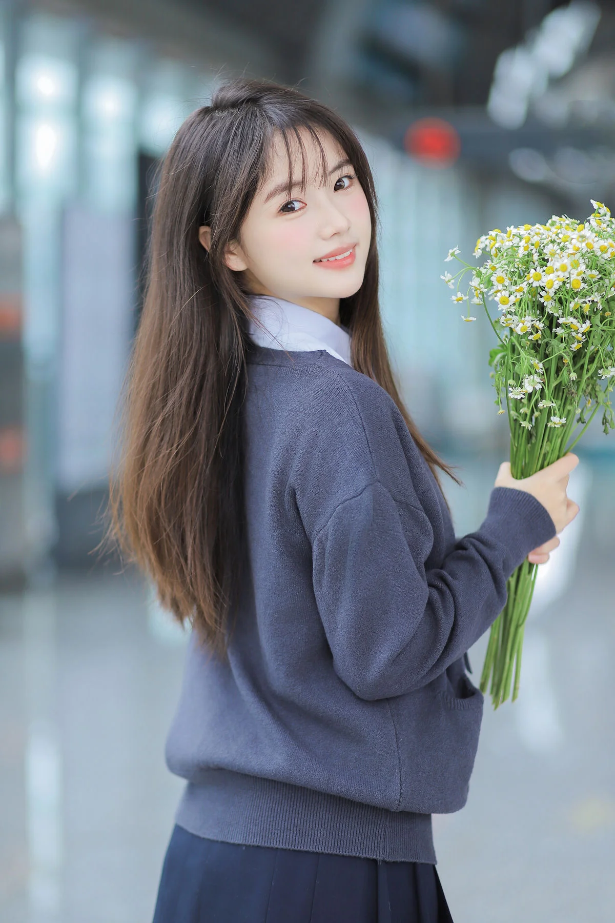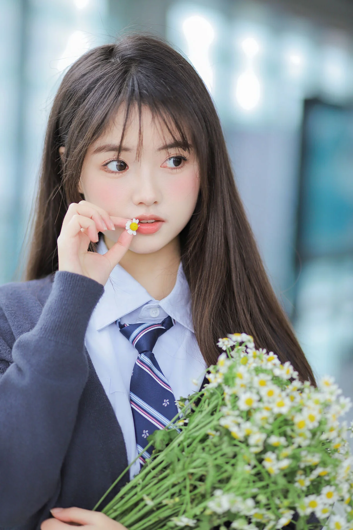 This captivating shot from YiTuYu Vol.8944 features the charming Bo Luo You Dian Tian embodying the very essence of youthful innocence and schoolyard nostalgia. Dressed in a classic Korean-style school uniform, she wears a deep navy knit cardigan layered over a crisp white shirt and a perfectly knotted striped tie, achieving a look that is both studious and incredibly sweet. The choice of soft textures and cool tones beautifully complements her radiant complexion and gentle features. Holding a lush bouquet of white chamomile flowers, the imagery creates a poetic contrast between the structured lines of academic attire and the wild beauty of nature. Her soft expression and dreamy gaze evoke a sense of longing for those sun-drenched afternoons spent in quiet contemplation. The lighting is masterfully handled to create a soft atmosphere that keeps every bit of focus on her graceful presence and the delicate details of her outfit. It is a perfect blend of fashion aesthetics and emotional storytelling, celebrating a minimalist yet deeply expressive visual language that feels both nostalgic and timelessly elegant.#SchoolgirlAesthetic #KoreanFashion #PortraitPhotography #YouthfulVibes #AcademicStyle