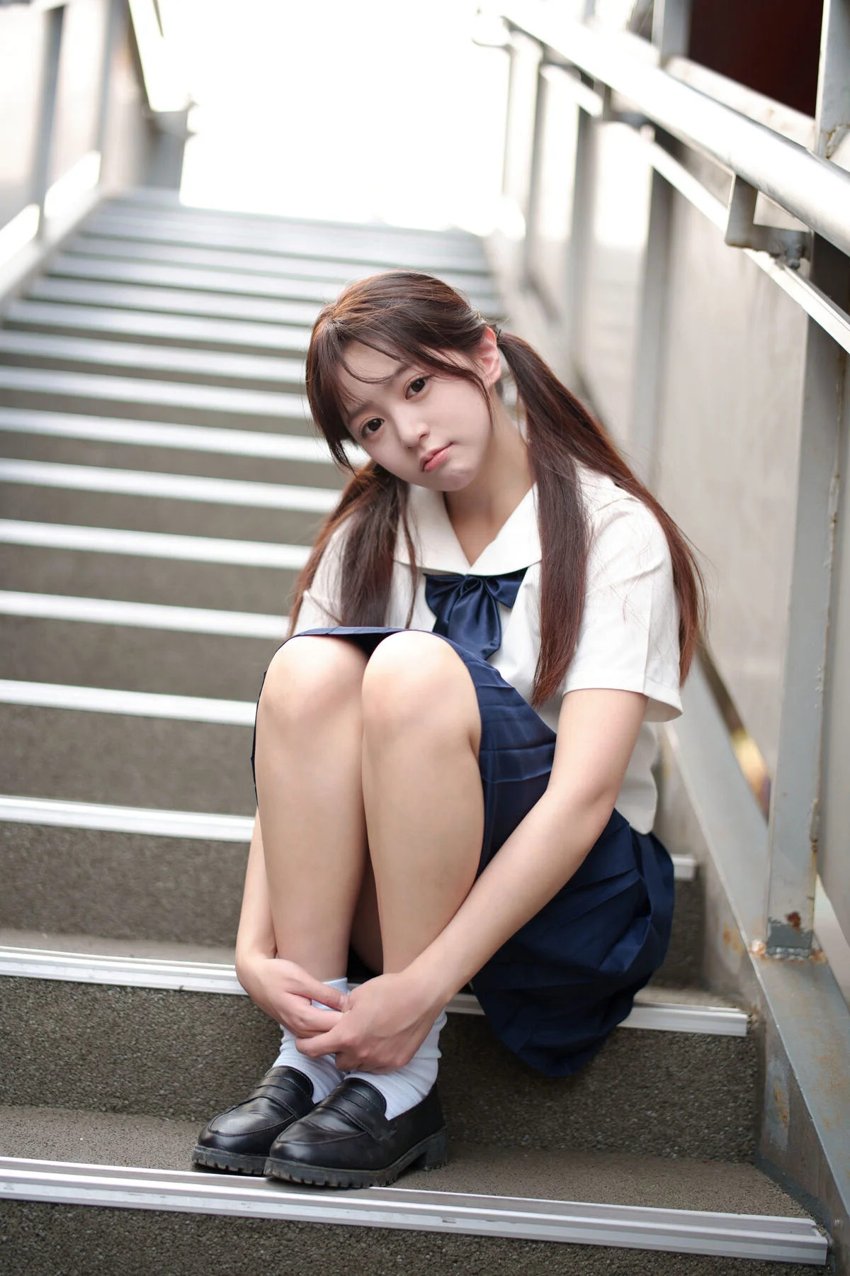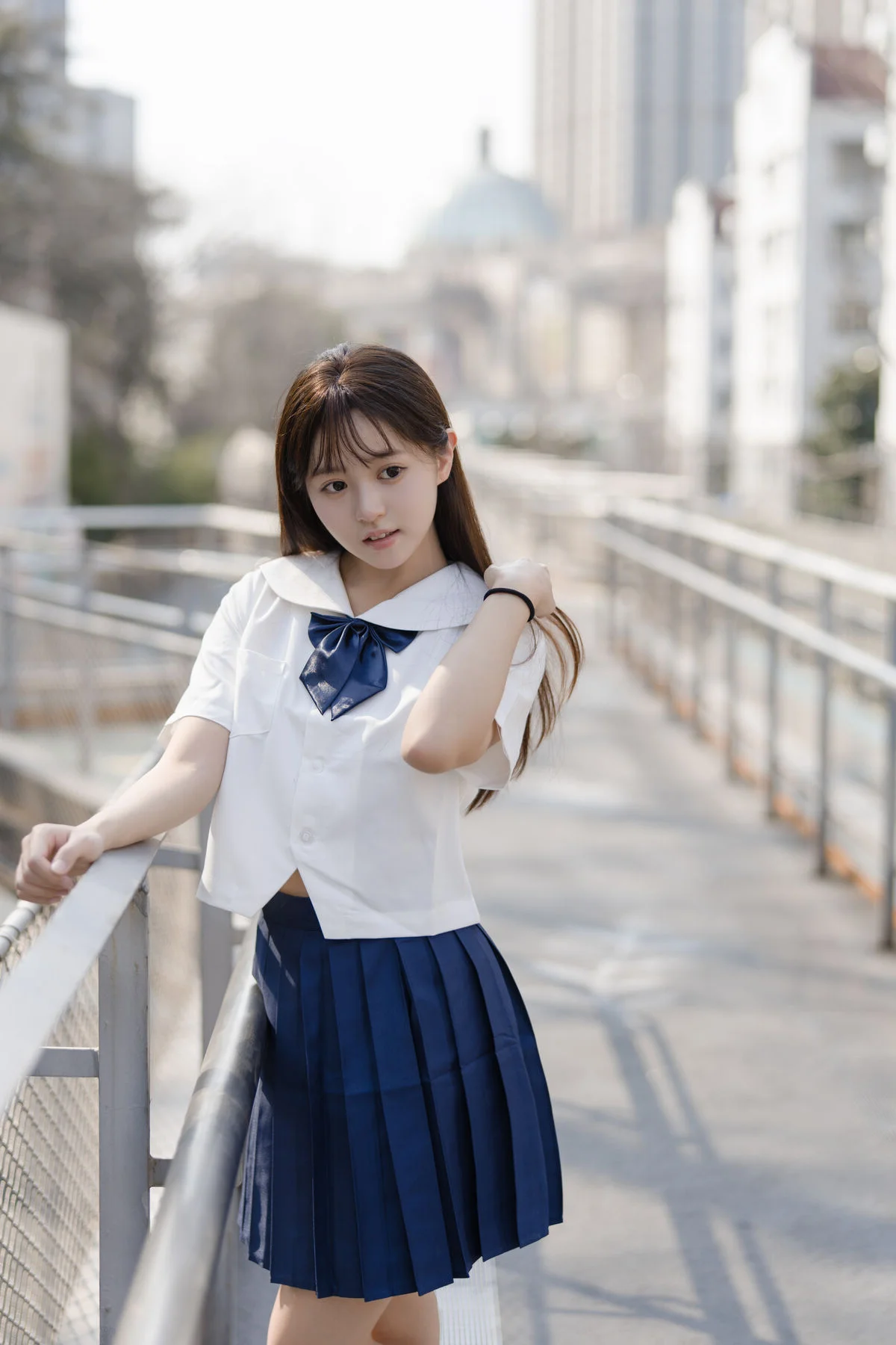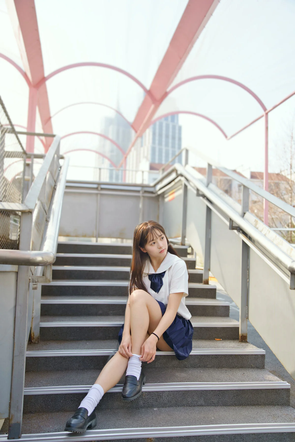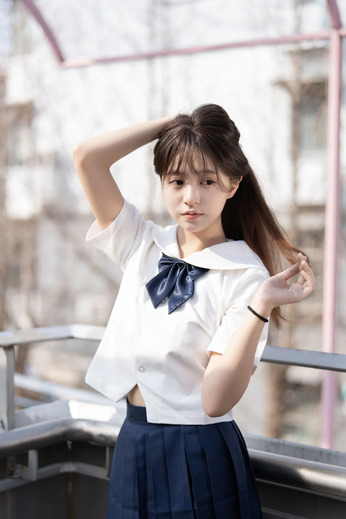Experience a poetic moment of youth as Nian Nian poses in a classic JK school uniform set against a weathered urban rooftop. The contrast between the raw concrete walls and the crisp white shirt creates a captivating visual narrative of innocence and urban exploration. Her grey plaid pleated skirt adds a textured layer to the minimalist aesthetic, perfectly complemented by white sneakers for a modern, youthful touch. The soft, overcast lighting enhances the melancholic yet serene mood of the shot, highlighting her pensive expression and natural grace. This 79P - 1V collection beautifully captures the essence of Japanese schoolgirl fashion, blending nostalgia with a contemporary artistic vibe. Every detail, from the gentle gaze to the effortless body language, invites the viewer into a world of quiet reflection and timeless beauty. It is a perfect example of how simple fashion choices can evoke deep emotions when placed in the right atmospheric setting.#NianNian #JKFashion #UrbanPhotography #YouthfulVibes #JapaneseStyle #PortraitArt