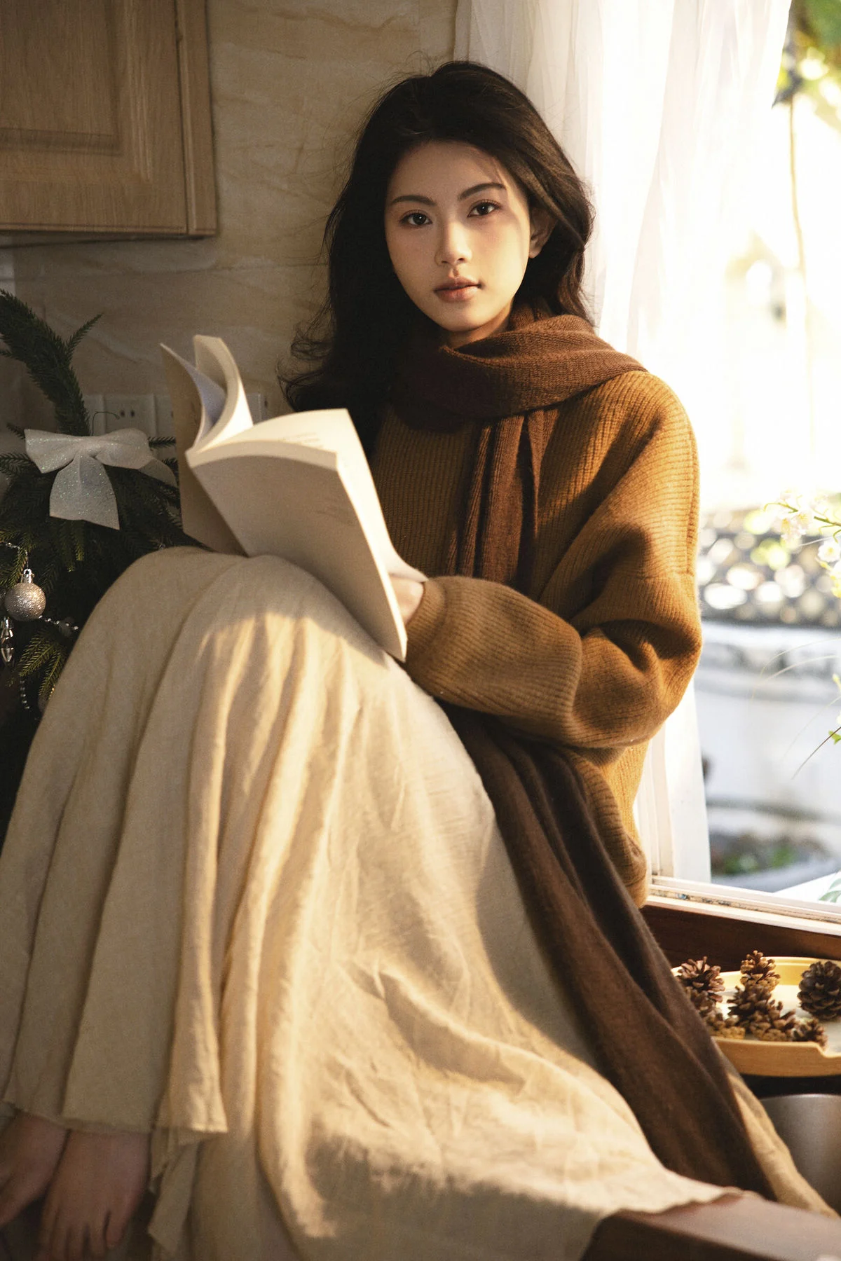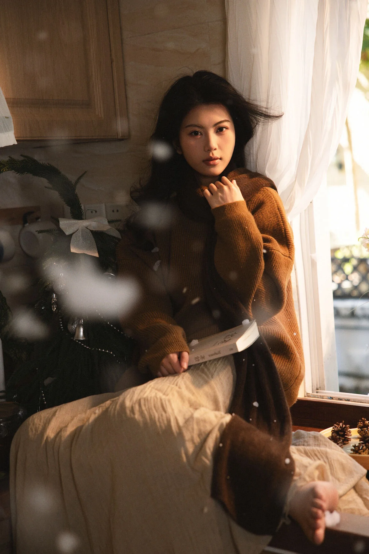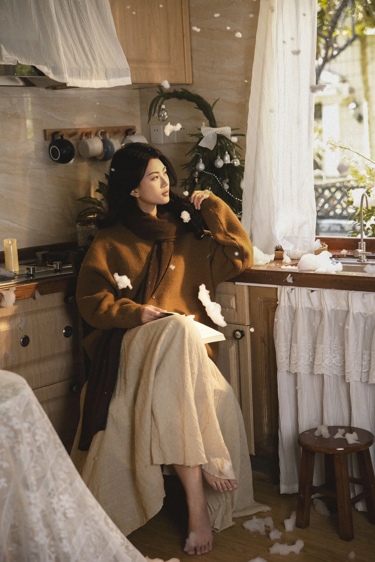 This captivating image from the YiTuYu Vol8785 collection beautifully portrays model Dan Dan her ethereal beauty shining through Perched gracefully by the window in a warm kitchen bathed in soft late autumn light Dan Dan’s gaze drifts into the distance hinting at a pensive and profound inner world Her cozy brown sweater and elegant cream-colored long skirt enhance her classic and refined charm The setting though simply adorned with subtle details like green foliage and candles creates a romantic and tranquil ambiance This moment invites viewers to delve into Dan Dan's deep introspection experiencing the quiet serenity and nostalgia of a peaceful autumn afternoon#DanDan #YiTuYu #AutumnVibes #CozyKitchen #EtherealBeauty